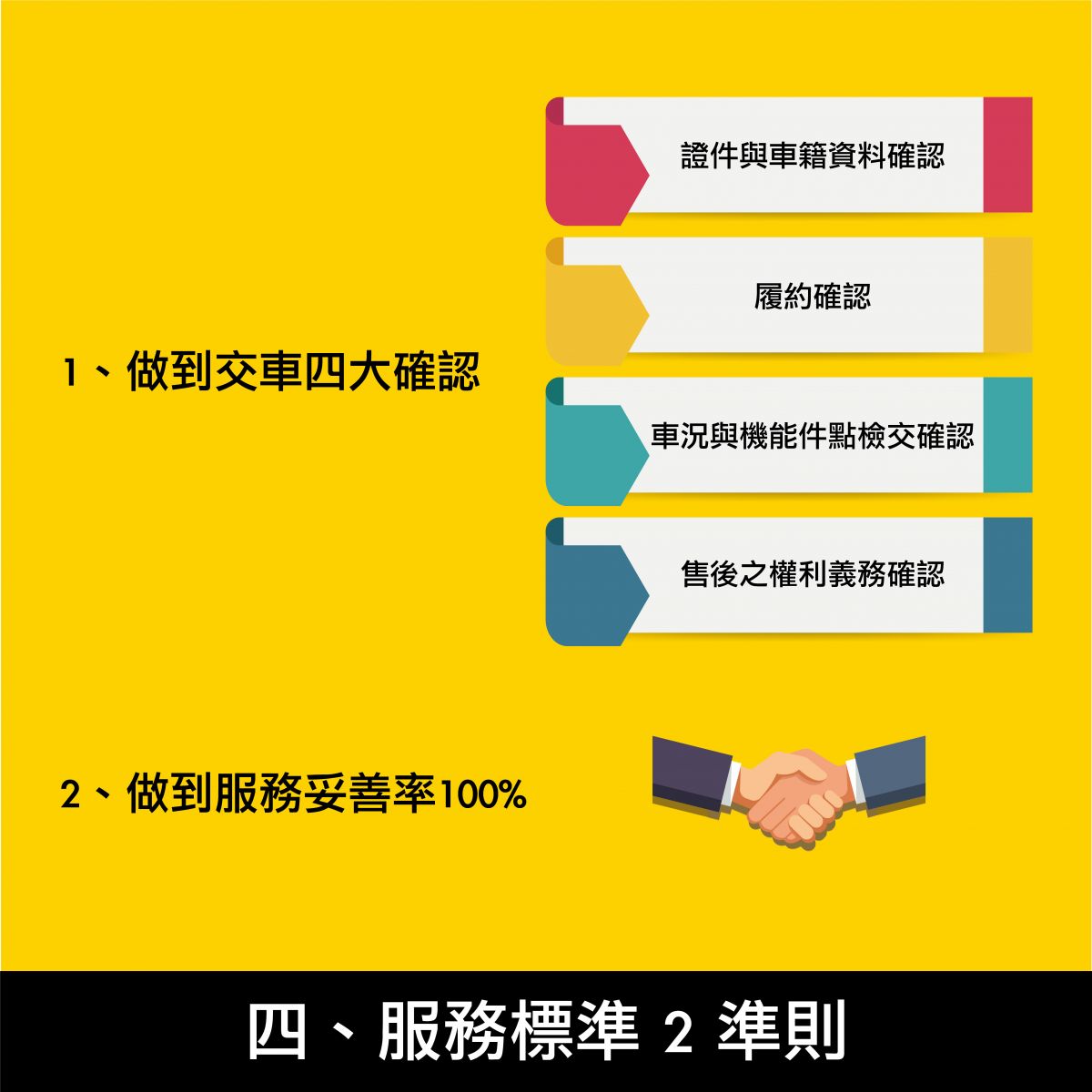 1、做到交車四確認:證件與車籍資料確認、履約確認、車況與機能件點檢交確認、售後之權利義務確認