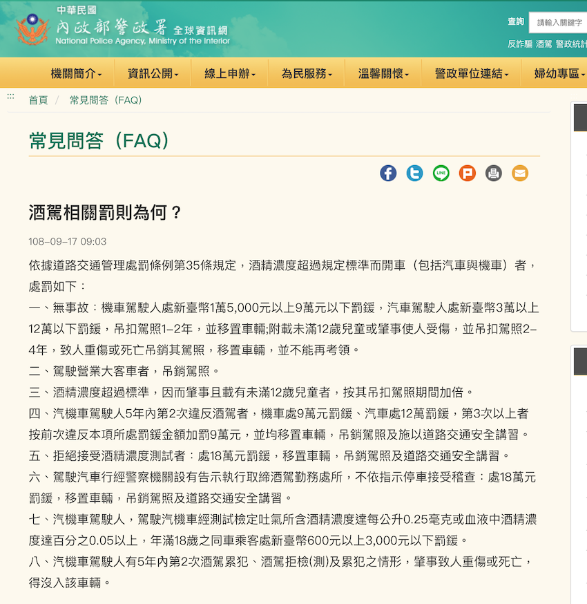 此為警政署關於酒駕的最新規定。(圖片來源:擷取自警政署網站)