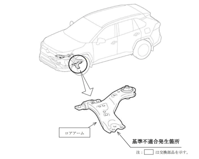 Toyota 表示,RAV4 第五代,生產時間為 2019 年 9 月 25 日至 10 月 26 日,會因為前輪避震器的材料不當,導致下懸吊臂產產生裂紋,若繼續使用,最壞的情況下,下懸吊臂可能會斷裂,嚴重影響行駛穩定性。