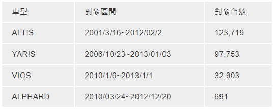 和泰汽車為維護TOYOTA車主行車安全,自2013年起已累積公告召回約21萬台車。台灣為高溫高濕國家,正好為高田氣囊瑕疵高風險地區,和泰汽車呼籲下列前乘客座氣囊受影響但尚未實施車主儘速回廠實施: