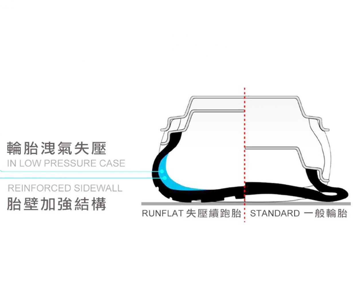 胎邊補強膠採用的狀態下,胎內空氣全數流失,胎壁依舊能保持良好支撐性,確保輪胎不會變形,提供行走能力。