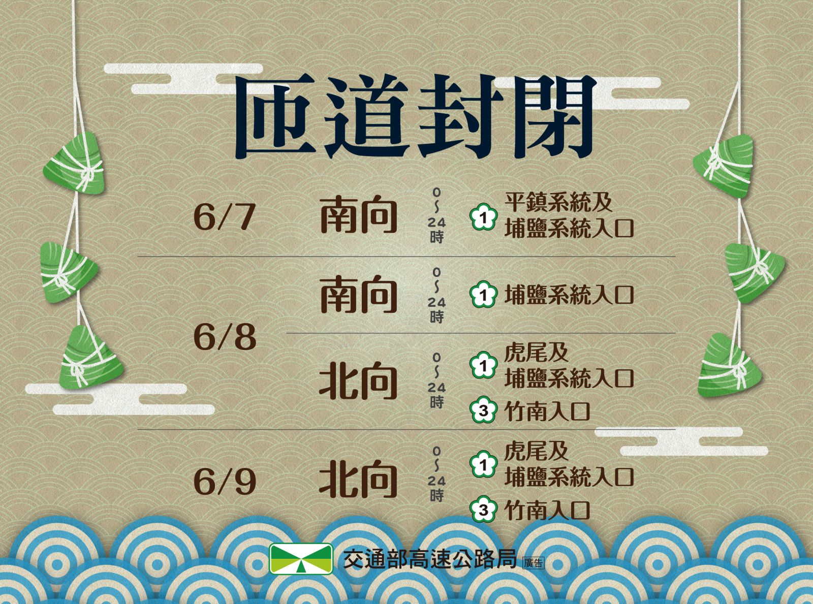 (三) 108年6月9日0至24時,封閉國1虎尾及埔鹽系統北向入口及國3竹南北向入口匝道。