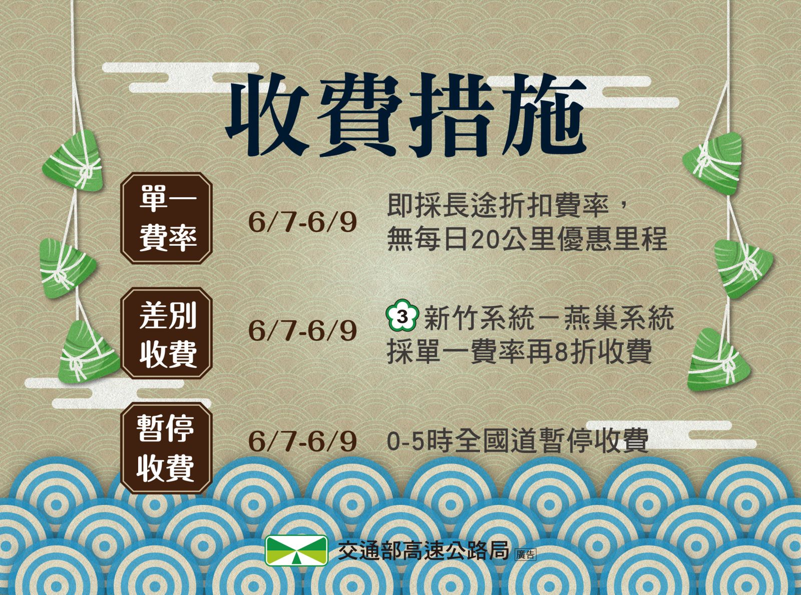(二) 路段差別費率:108年6月7日至6月9日,國3「新竹系統至燕巢系統」採單一費率再8折收費。