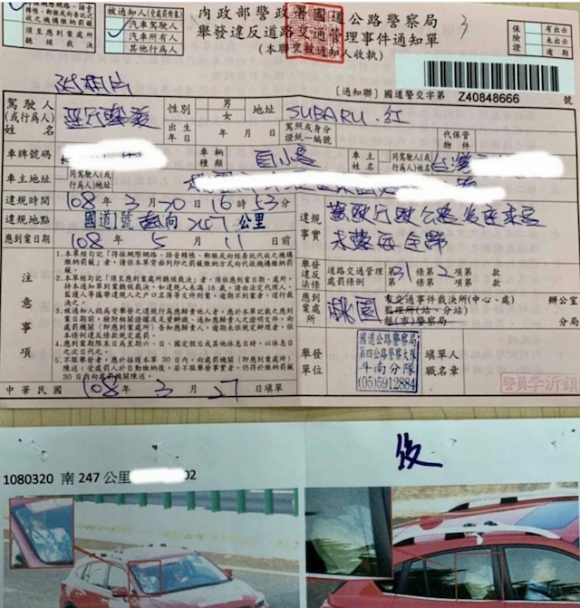 南投縣警察局交通隊組長李安景說,網路傳出的這張罰單,係由國道公路警察局第 4 公路警察大隊斗南分隊開出的,一般而言,罰單上駕駛人(或行為人)姓名欄中,若直接載明違規者姓名,便代表是被員警直接攔檢,而該罰單則是書寫「逕行舉發」,則代表是被攝影器材拍到的,也難怪有的網友稱讚警方照相技術高超,連後座乘客未繫安全帶也都能清楚拍得到。