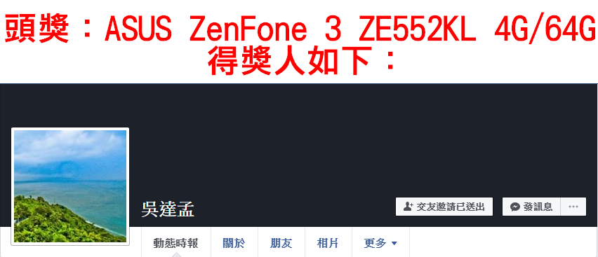 頭獎: ASUS ZenFone 3 ZE552KL 4G/64G *一隻 共 1 名