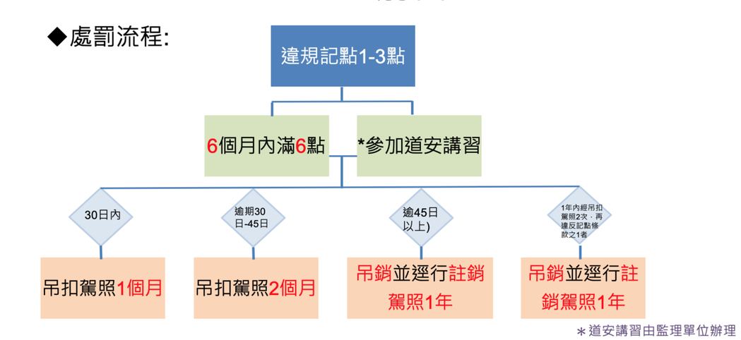 裁決所違規裁罰課長吳素禎表示,依規定,駕駛人違規依情節輕重分別記點1至3點,6個月內記點達6點以上者吊扣駕照1個月,並應參加道安講習,逾期繳交駕照者則吊扣駕照2個月,若仍未到案將註銷駕照1年;而1年內經吊扣駕照2次,再違反記點條款者,則吊銷駕照1年。
