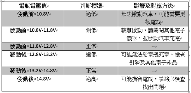 還有一個電瓶電壓項目。先說明一個基本觀念,車子要能順利啟動電瓶電壓一定要12.3V以上,若低於11.8V基本上車就會不夠電來啟動車子,如果測得9-10v多,這時候就會建議要更換電瓶了。但電壓正常並不等於電瓶功效,僅為參考值,還需考量發電機狀況與電瓶使用期限的可堪用度。