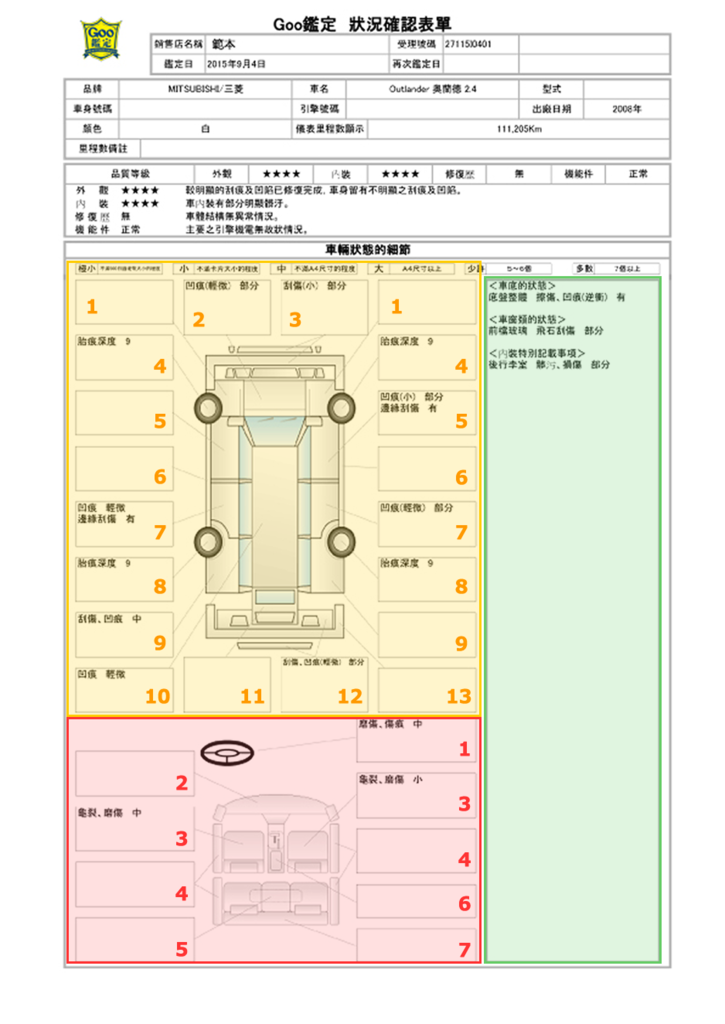 此部分為Goo鑑定登載的細節,一般來說,如果狀況為正常的部分,我們鑑定師就不會特別再做記載,而那些小摩擦小耗損,哪邊有問題則會記載在鑑定證書上的狀況確認表單上。包括:胎痕深度、葉子板有無更換過、有無刮傷、菸疤等等,請務必詳讀。