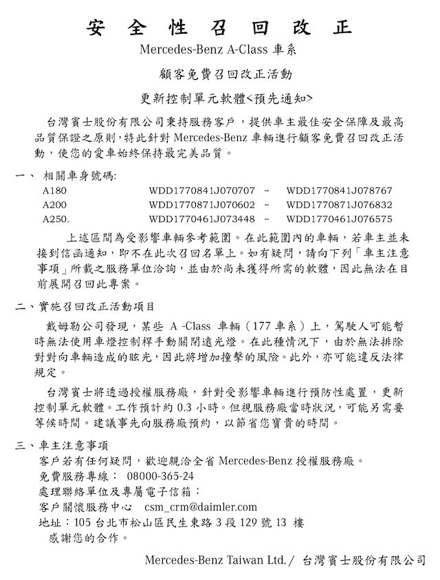 台灣賓士貼出安全性召回修正,針對台灣販售 A-Class 旗下車款,分別為 A180、A200 及 A250 其相關車身號碼的受影響車輛進行召回。