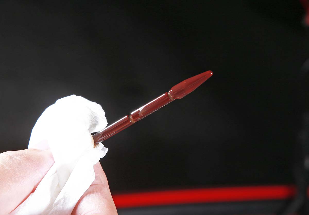 然後使用衛生紙將整支油尺擦乾淨,再插回去到底,之後再拔出來觀察油位高度。