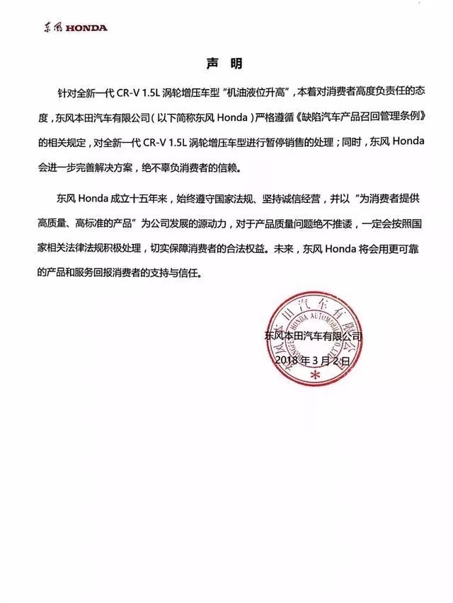 來自中國消息指出,儘管東風本田尚未做出回應,但東風本田經銷商已證實,立刻停售 2018 年式 CR-V,待維修完成後將會重新銷售,但交車時間未定。
