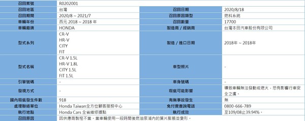 誠如先前所述,交通部已同意台灣Honda所提報之品牌車款CR-V、HR-V、CITY、FIT車型,燃油泵浦瑕疵案召回改正計畫,並於9/15公布相關訊息;據了解,由於供應商製程不當,上述車款其採用的燃油泵浦葉片,恐在長時間使用後,出現膨脹、變形之現象,極端狀況下更可能造成車輛熄火或是無法發動;台灣Honda在與日本母廠聯繫過後,遂於近期發佈了正式召回公告。