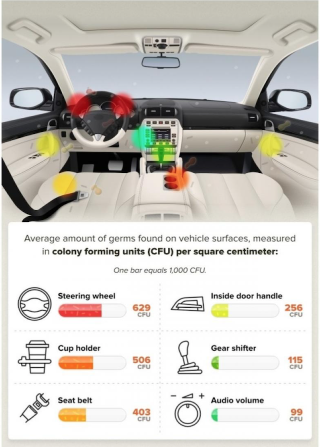 美國曾有一項調查指出,只有 3 成的駕駛會定期清潔車室。美國國家生物技術信息中心也曾公布車內各部位細菌數量,以每平方厘米的平均細菌數量(CFU)為單位,最高的是方向盤的 629CFU,其次為杯架的 506CFU,第三名則是安全帶的 403CFU,而這些地方都是最容易滋生細菌的部位。