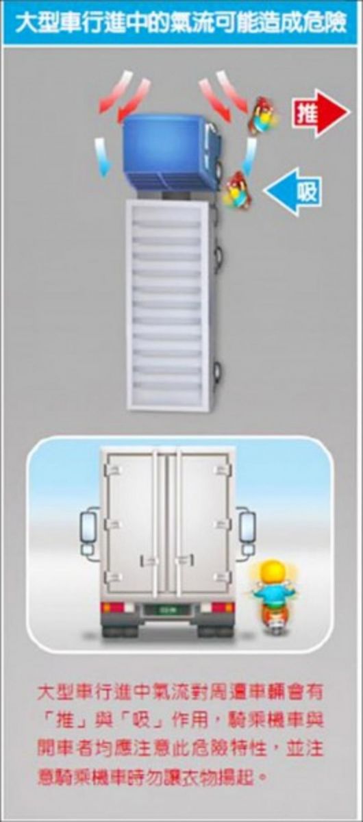 大客車行進中氣流會對機車造成「推」與「吸」的作用,「機車防禦駕駛」課程建議應注意此危機,更要避免衣角揚起造成更大危險。(取自交通部網站)