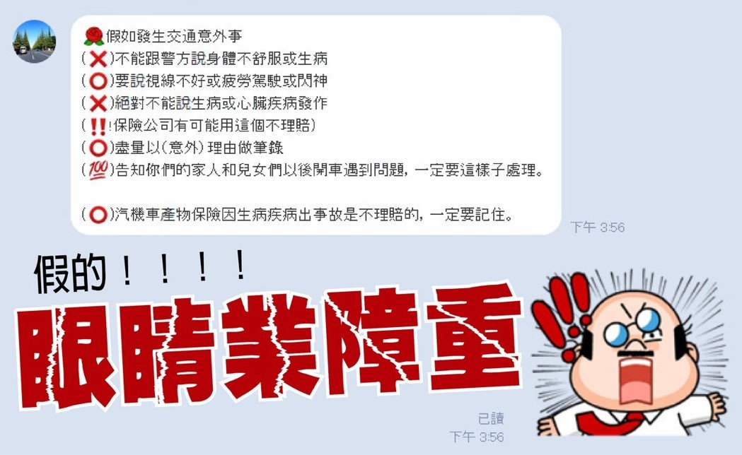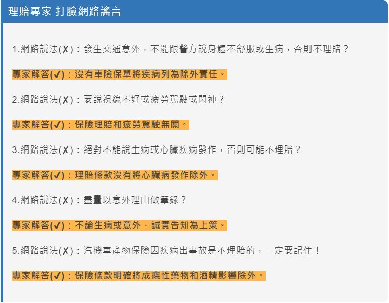 保險專家表示,看起來網路上的說法,是在教導車主,發生車禍意外,寧可承認自己技術差,也不能承認身體差;但事實上汽車保險共同條款只有故意或犯罪行為,為除外不保事項,目前沒有車險保單把疾病列為不保事項,因此不管是不是心臟病發導致車禍意外,保險都沒有說不理賠。