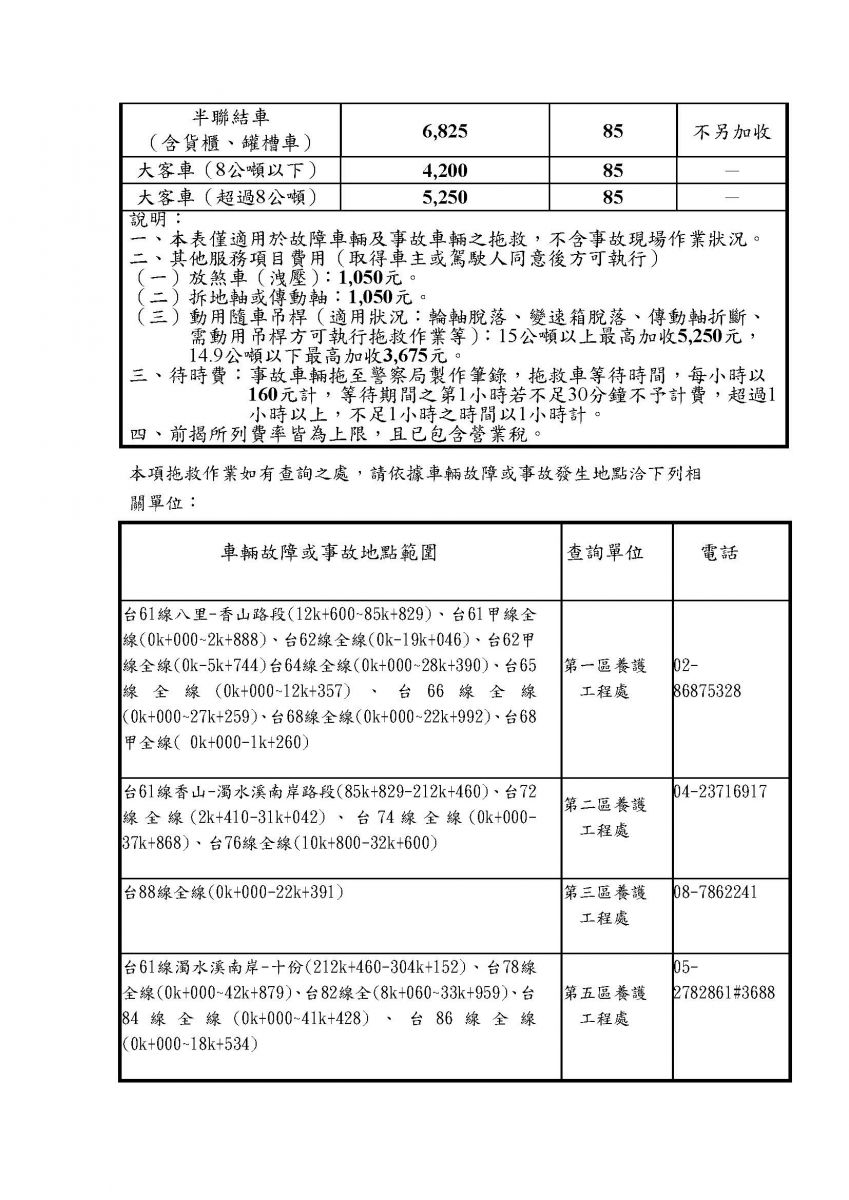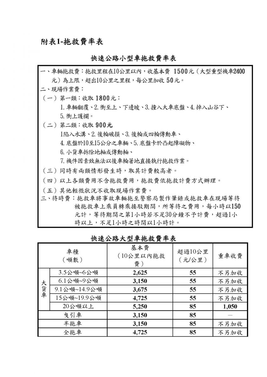 公路總局鑒於快速公路陸續完工通車,為了增進省道快速公路路網之行車安全,已於108年7月26日訂定「交通部公路總局快速公路車輛拖救服務作業要點」,公告開放拖救車業者申請,比照國道辦理快速公路特約拖救車,訂定小型車及大型車收費基準。