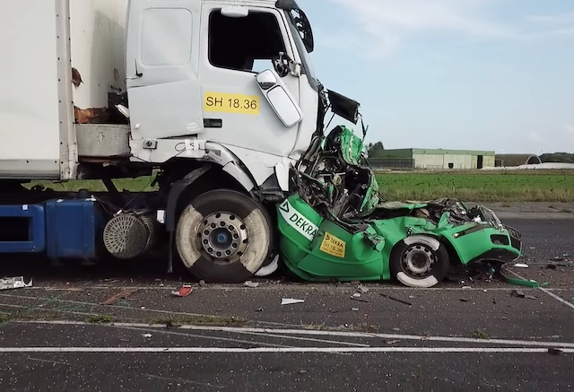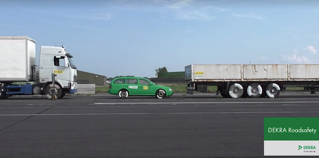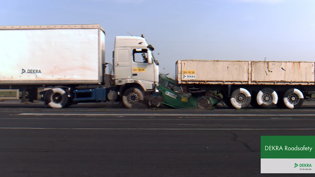 這支由 Dekra 所公布的測試影片,就是高速公路上塞車,一輛小客車呈現靜止狀態,並停在前方的大貨車後方,看似無異狀,不過後方的大貨車在時速僅 43 公里的情況下,卻撞向小客車,只見小客車遭撞擊擠壓後,完全變成一堆廢鐵,儘管這只是測試,並無任何人坐在車上,但可以確定,在這麼嚴重的撞擊之下,除了車輛已經無法修復,而且也沒有人能夠倖存。