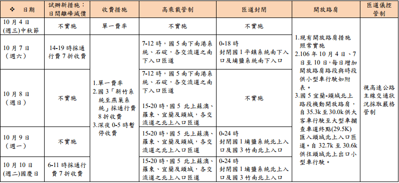 5、開放路肩:現有開放路肩措施照常實施外,106年10月4日、10月7日至106年10月10日,每日增加開放路肩路段與時段供小型車行駛:國1、國3,中秋、國慶連假開放路肩路段與時段查詢。