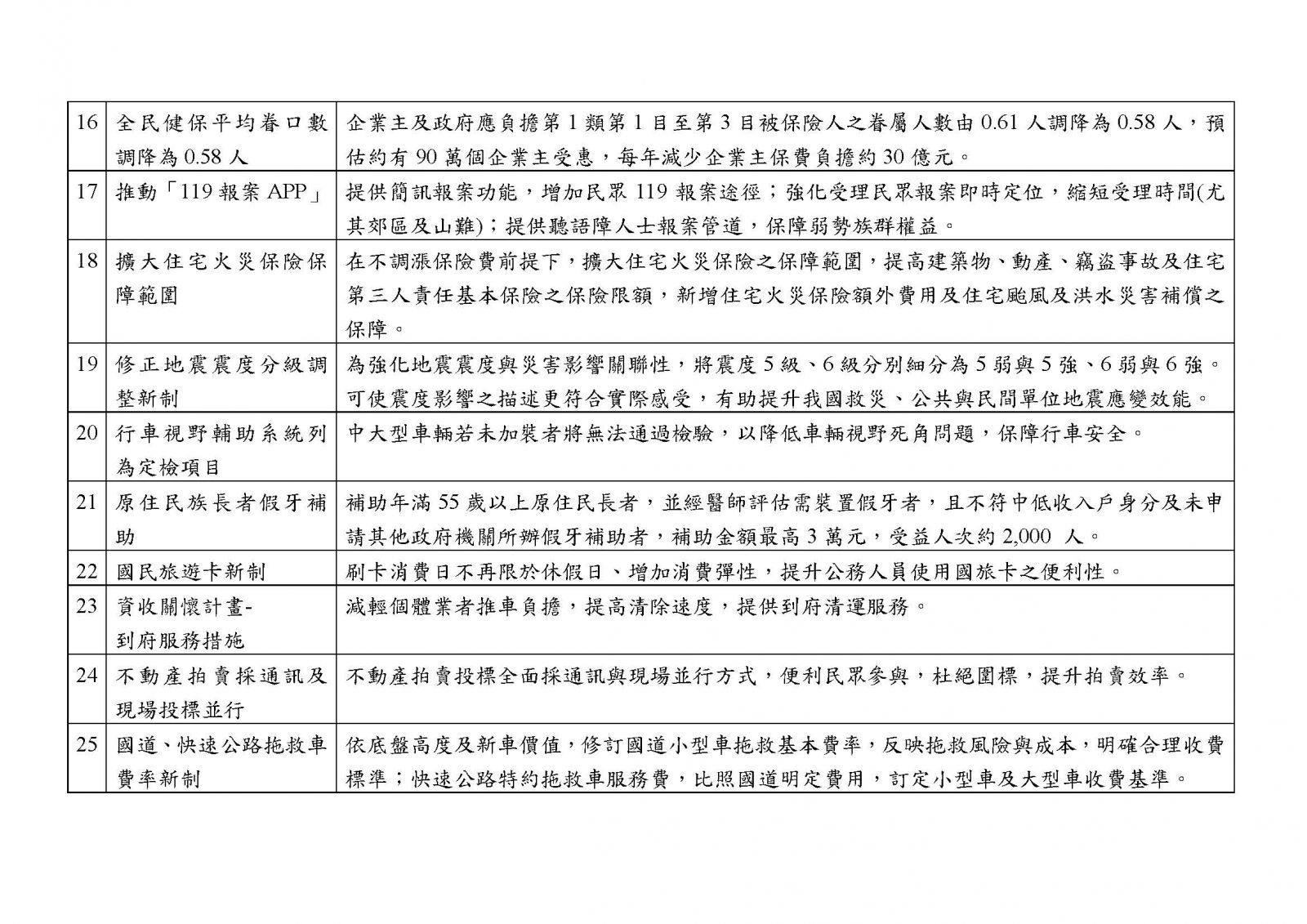 另外,擴大農機補助、推動農產品初級加工 場管理制度 、擴大遠距醫療門診、擴大住宅火災保險保 障範圍、行車視野輔助系統列 為定檢項目等等。