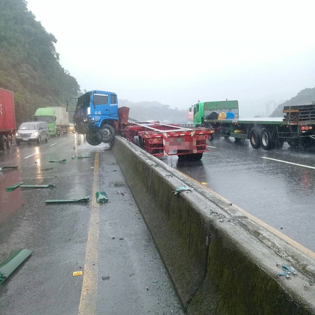 基隆市今天雨勢不斷,中山高和台62線快速道路都發生車輛打滑事故。李姓男子清晨行經在中山高五堵路段,目睹前車打滑驚險畫面,將行車記錄器畫面PO網,貼文「這種跑馬燈劇情....都醒了」,引發網友討論。一輛貨櫃車中午行經台62線暖暖路段,也疑因天雨路滑,衝撞分隔島後,車頭卡在分隔島上。