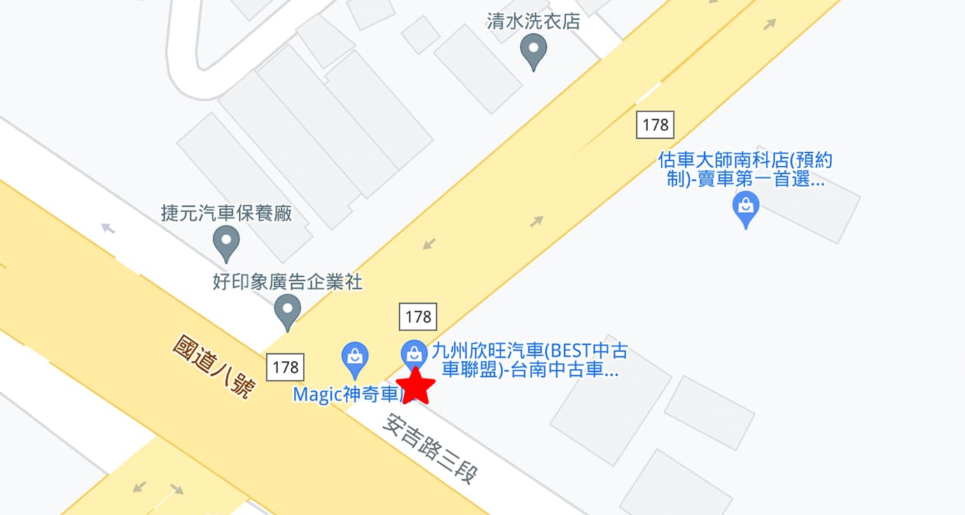 BEST賞車據點 BEST九州欣旺汽車 06-5939245 台南市安定區港南里港口1之66號 (國道8號旁,鄰近港口派出所)
