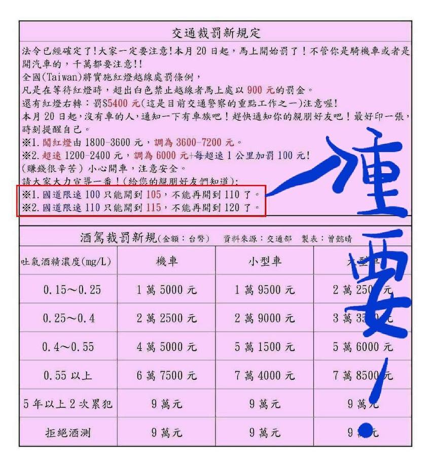 此為在網路上流傳的交通裁罰新規定,多半為假消息。(圖片來源:擷取自網路)