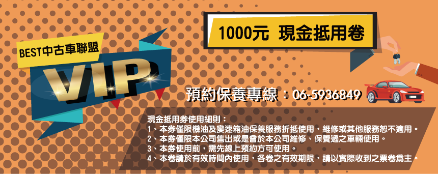 第一好禮:VIP客戶歡迎禮-保養現金抵用券1000元,提醒您此張抵用券使用前需先請您在此對話框輸入您的愛車之車主姓名及車牌號碼,即可立即使用此張抵用券唷!趕快輸入給Penny知道吧~!也趕緊讓周遭的好朋友加入領取好康吧!