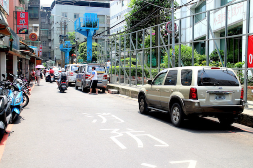 紅線禁止停車,但可依照實際道路狀況,由執法人員決定是否開罰。(記者郭逸攝)
